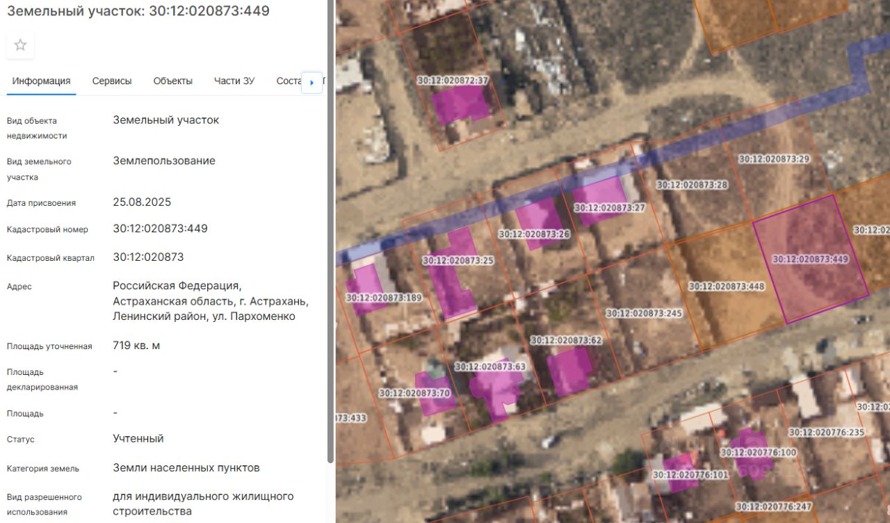 Земельный участок площадью 719 кв.м., расположенный по адресу: Российская Федерация, Астраханская область, г. Астрахань, Ленинский район, ул. Пархоменко с кадастровым номером 30:12:020873:449, с видом разрешенного использования - для индивидуального жилищного строительства