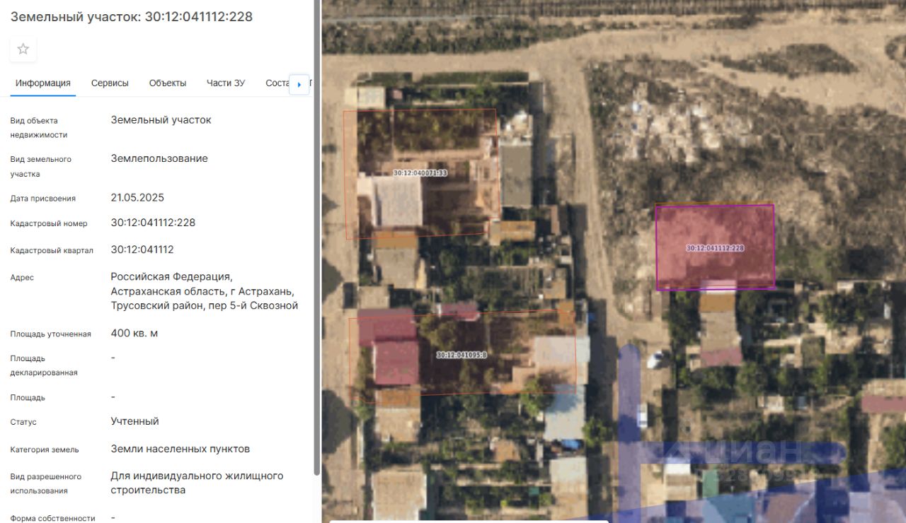 Земельный участок площадью 400 кв.м., расположенный по адресу: Российская Федерация, Астраханская область, г Астрахань, Трусовский район, пер. 5-й Сквозной с кадастровым номером 30:12:041112:228, с видом разрешенного использования - для индивидуального жилищного строительства