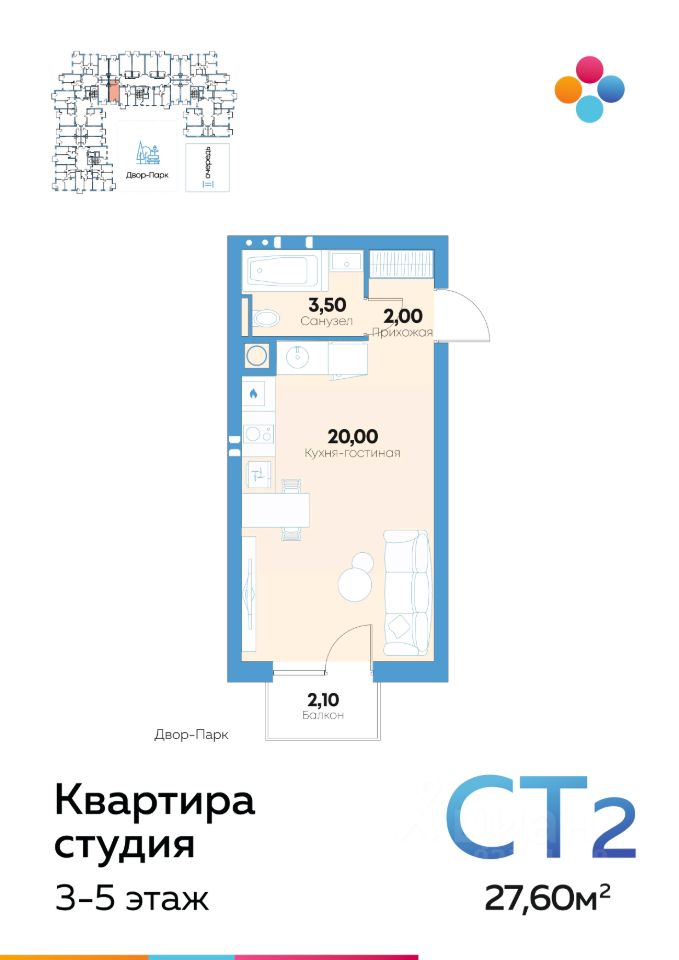 Уютная светлая квартира-студия площадью 26 м² идеально подойдет молодым, творческим, современным людям, живущим одним, или паре без детей.