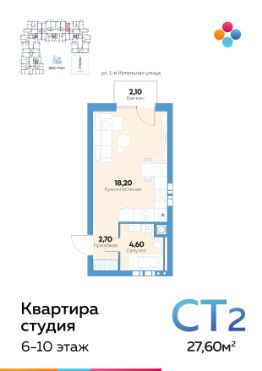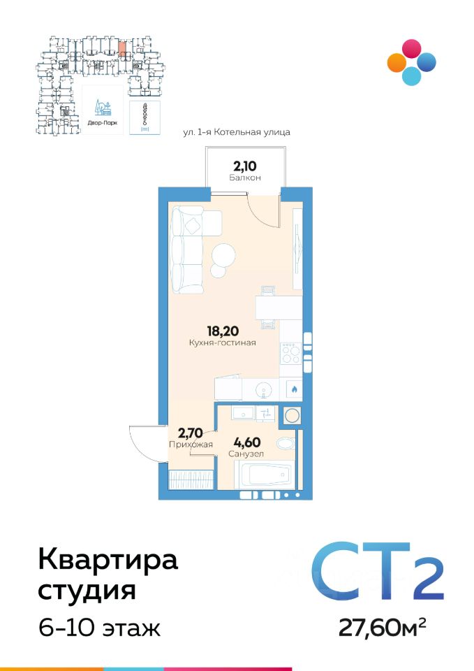 Уютная светлая квартира-студия площадью 26 м² идеально подойдет молодым, творческим, современным людям, живущим одним, или паре без детей.