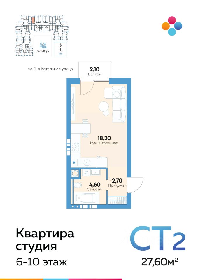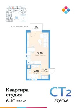 Уютная светлая квартира-студия площадью 26 м² идеально подойдет молодым, творческим, современным людям, живущим одним, или паре без детей.