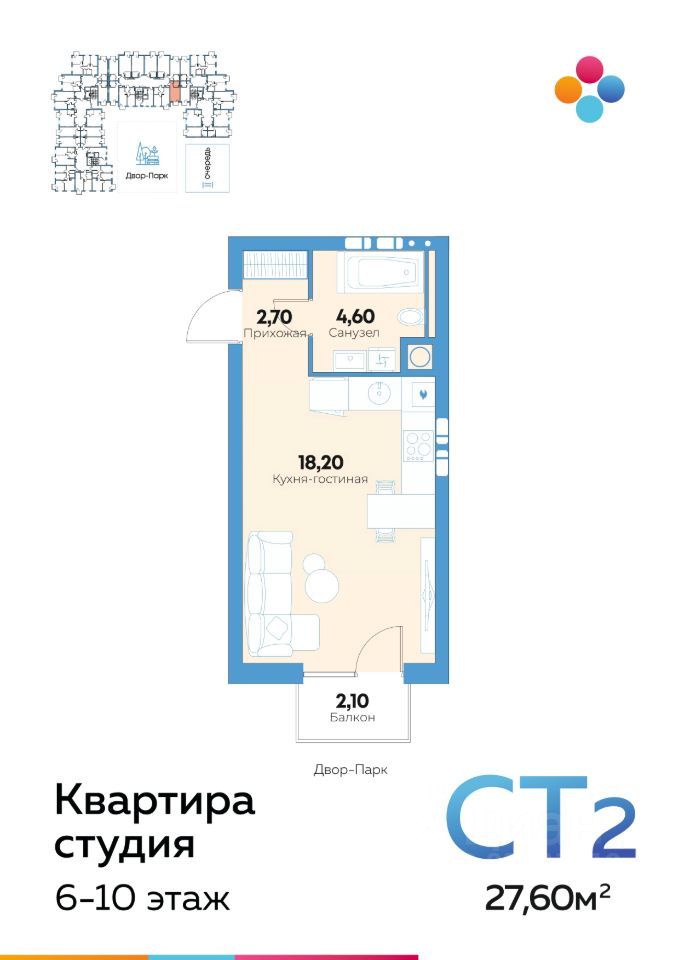 Уютная светлая квартира-студия площадью 26 м² идеально подойдет молодым, творческим, современным людям, живущим одним, или паре без детей.
