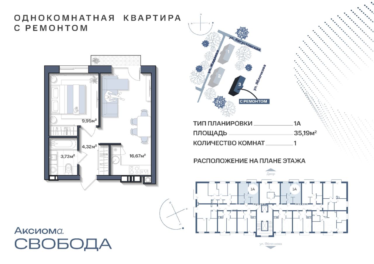 Продаётся 1-комнатная квартира в строящемся доме (Дом 3), срок сдачи: IV-кв. 2026, общей площадью 35.18 кв.м., на 11 этаже. Свобода духа, свобода выбора, свобода творчества! Место, где вы точно станете автором своей жизни! Аксиома. Свобода - новый проект с современным подчерком, для тех, кто стремится жить со вкусом и по своим правилам! Это место для тех, кто ценит комфорт, но одновременно желает находиться в потоке современной жизни. Проект комфорт-класса расположен на улице Августовская 70. Это живописный район вблизи реки и развитой производственно-торговой части города с крупной транспортной развязкой. В шаговой доступности вся необходимая инфраструктура: садики, школы, спортивные и медицинские учреждения, торговый центр.