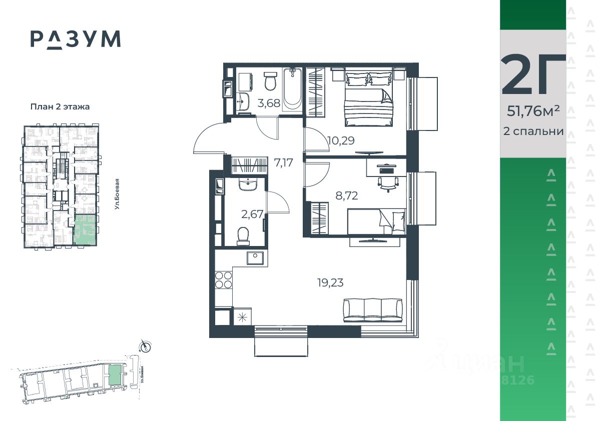 "РАЗУМ на Боевой" жилой комплекс компании "РАЗУМ", создателя "Сердце Каспия" и "Наследие". Проект из трех 18-этажных домов расположен в самом центре Советского района, на улице Боевая. В пешей доступности: - 3 школы; - 3 детских сада; - магазины; - автобусная остановка; Главная особенность проекта — угловое остекление, которое составляет 22% от всей площади. Все окна в квартирах находятся на высоте 62 см от пола, а на восемнадцатом этаже подоконник расположен всего в 42 см от пола. Во дворе-парке для детей создана своя развивающая среда, где каждый ребёнок может найти себе занятия и игры по душе. Здесь дети активно развиваются и познают окружающий мир. Игровые конструкции изготовлены из натуральных материалов, поэтому они не замерзают на морозе и не нагреваются на солнце. Необычные формы конструкций развивают образное мышление у детей и помогают им придумывать интересные и нестандартные игры. "РАЗУМ на Боевой" — это: - территория без машин; - безбарьерная среда; - единый эко-стиль в оформлении дворового пространства; - увеличенная площадь озеленения во дворе-парке; - многоуровневое освещение и подсветка фасадов; - видеонаблюдение; - эстетичные подъездные холлы; - колясочные и велосипедные зоны; - кладовые на каждом этаже. В проекте представлены 13 планировочных решений с площадью квартир от 21 м² до 62.2 м² с функциональным разделением на гостевую и приватные зоны.