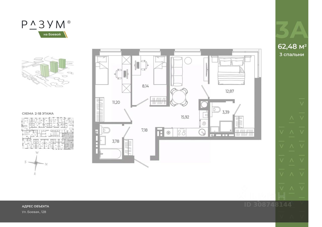 "РАЗУМ на Боевой" жилой комплекс компании "РАЗУМ", создателя "Сердце Каспия" и "Наследие". Проект из трех 18-этажных домов расположен в самом центре Советского района, на улице Боевая. В пешей доступности: - 3 школы; - 3 детских сада; - магазины; - автобусная остановка; Главная особенность проекта — угловое остекление, которое составляет 22% от всей площади. Все окна в квартирах находятся на высоте 62 см от пола, а на восемнадцатом этаже подоконник расположен всего в 42 см от пола. Во дворе-парке для детей создана своя развивающая среда, где каждый ребёнок может найти себе занятия и игры по душе. Здесь дети активно развиваются и познают окружающий мир. Игровые конструкции изготовлены из натуральных материалов, поэтому они не замерзают на морозе и не нагреваются на солнце. Необычные формы конструкций развивают образное мышление у детей и помогают им придумывать интересные и нестандартные игры. "РАЗУМ на Боевой" — это: - территория без машин; - безбарьерная среда; - единый эко-стиль в оформлении дворового пространства; - увеличенная площадь озеленения во дворе-парке; - многоуровневое освещение и подсветка фасадов; - видеонаблюдение; - эстетичные подъездные холлы; - колясочные и велосипедные зоны; - кладовые на каждом этаже. В проекте представлены 13 планировочных решений с площадью квартир от 21 м² до 62.2 м² с функциональным разделением на гостевую и приватные зоны.