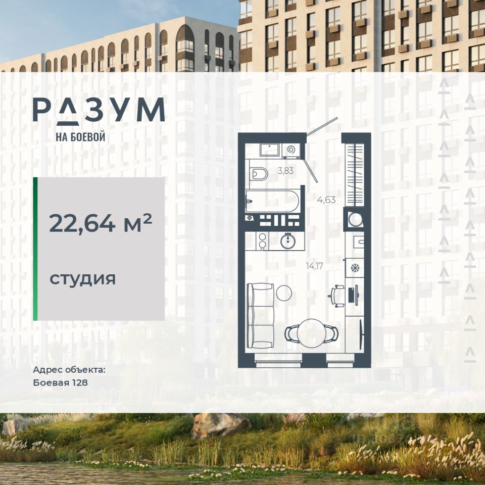 РАЗУМ на Боевой жилой комплекс компании РАЗУМ, создателя Сердце Каспия и Наследие. Проект из трех 18-этажных домов расположен в самом центре Советского района, на улице Боевая. В пешей доступности: - 3 школы; - 3 детских сада; - магазины; - автобусная остановка; Главная особенность проекта — угловое остекление, которое составляет 22% от всей площади. Все окна в квартирах находятся на высоте 62 см от пола, а на восемнадцатом этаже подоконник расположен всего в 42 см от пола. Во дворе-парке для детей создана своя развивающая среда, где каждый ребёнок может найти себе занятия и игры по душе. Здесь дети активно развиваются и познают окружающий мир. Игровые конструкции изготовлены из натуральных материалов, поэтому они не замерзают на морозе и не нагреваются на солнце. Необычные формы конструкций развивают образное мышление у детей и помогают им придумывать интересные и нестандартные игры. РАЗУМ на Боевой — это: - территория без машин; - безбарьерная среда; - единый эко-стиль в оформлении дворового пространства; - увеличенная площадь озеленения во дворе-парке; - многоуровневое освещение и подсветка фасадов; - видеонаблюдение; - эстетичные подъездные холлы; - колясочные и велосипедные зоны; - кладовые на каждом этаже. В проекте представлены 13 планировочных решений с площадью квартир от 21 м² до 62.2 м² с функциональным разделением на гостевую и приватные зоны.