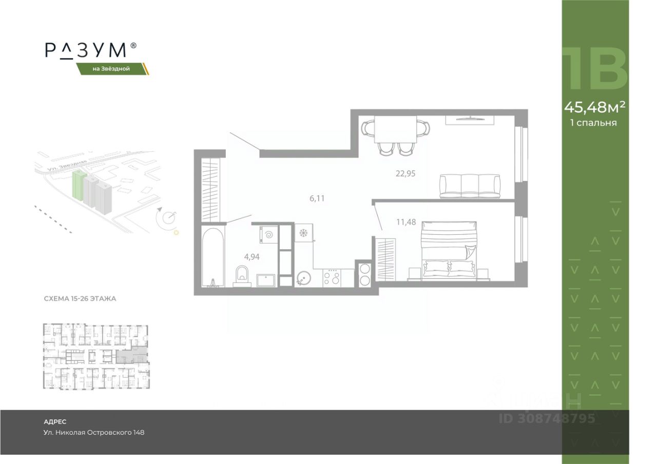 РАЗУМ на Звездной высотный жилой комплекс компании РАЗУМ, создателя Сердце Каспия и Наследие. Здесь есть: развитый район, закрытая безопасная территория и транспортная доступность. Три 26-этажных дома расположены в границах ул. Звездной и Николая Островского. В пешей доступности: - 3 школы; - 4 государственных детских сада; - гипермаркет; - супермаркеты; - развивающие образовательные центры. РАЗУМ на Звездной это: - 60% озеленения в благоустройстве, детские игровые конструкции и зоны отдыха выполнены из экологичных материалов; - многоуровневое освещение территории с архитектурной подсветкой комплекса; - закрытая территория комплекса и видеонаблюдение по периметру и в холлах; - безбарьерная среда на территории жилого комплекса: удобство для велосипедистов, родителей с маленькими с детьми и путешественников с большими чемоданами; - уютная зона ожидания с мягкой мебелью в холлах проекта и раздельные зоны под колясочные и велосипедные; - кладовые помещения на каждом этаже. В проекте РАЗУМ на Звездной представлено 13 планировочных решений от 21,08 м² до 63,39 м². Есть квартиры с предчистовой отделкой. В квартирах выровнены стены, выполнена полусухая стяжка пола, установлены радиаторы и трехконтурный газовый котел. В квартиру заведено электричество и установлена входная дверь.