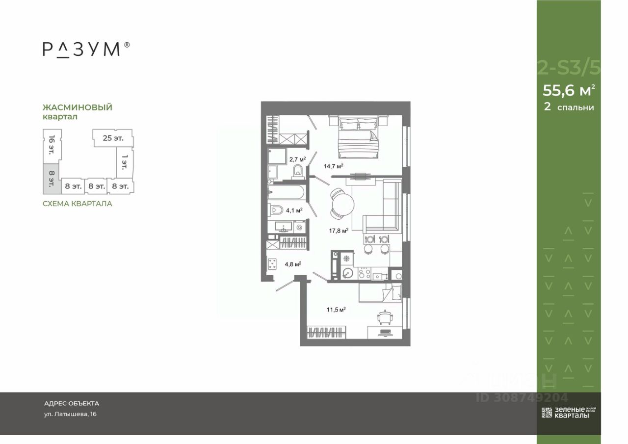 В проекте представлены 107 планировочных решений: от уютных студий 31,1 м² до квартир с тремя спальнями и кухней-гостиной 128 м² с функциональным разделением на гостевую и приватные зоны.
