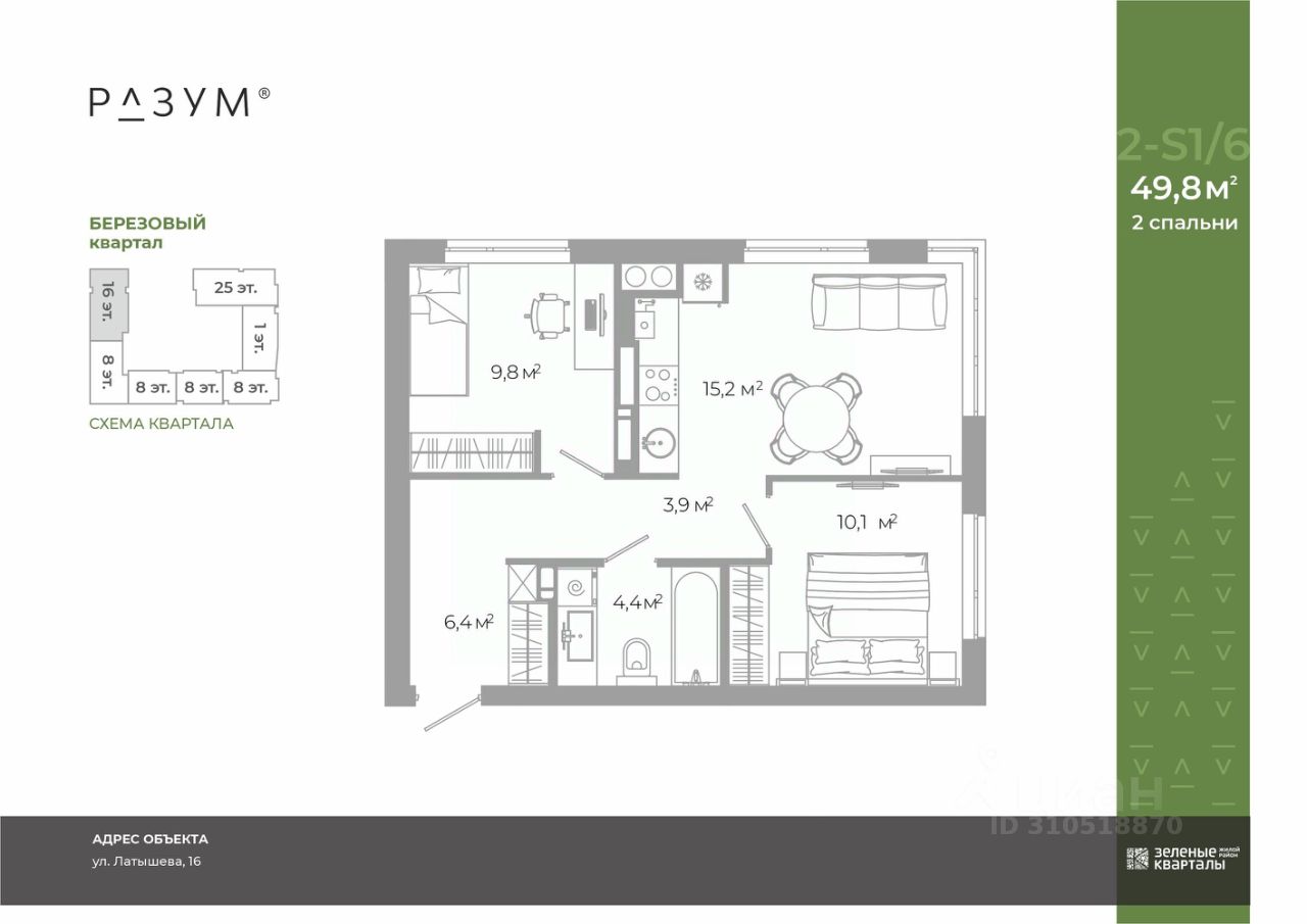 "Зеленые кварталы" — первый жилой район от компании "РАЗУМ", создателя "Сердце Каспия" и "НАСЛЕДИЕ" в Астрахани, состоящий из пяти зелёных кварталов, объединенных общим бульваром. Жилой район расположен в центре университетской жизни Астрахани. Рядом находятся детские сады, школы, Центральный стадион, досуговые и развивающие центры и большая прогулочная зона вдоль Комсомольской набережной. Общая площадь благоустройства проекта — 7 гектаров. Главная особенность проекта — переменная этажность домов от 8 до 25 этажей. Березовый квартал — территория изысканности с 2 уровнями благоустройства территории. Первый уровень — свой двор-парк. Это благоустроенная придомовая территория с дендропарком, в котором деревья и кустарники высажены с учетом всех четырех сезонов. Второй уровень — просторный бульвар протяженностью 270 м, объединяющий все кварталы в единой целое. "Зеленые кварталы" — это - территория без машин; - безбарьерная среда; - единый экостиль в оформлении дворовых пространств в соответствии с названием квартала; - 24 тематические зоны на бульваре: пространства для отдыха и релакса с гамаками и шезлонгами, центральная площадь с амфитеатром и контактным фонтаном, 2 зоны work-out, детские игровые площадки, разделенные по возрастам, тарзанка, водные и скалолазные конструкции, песочницы, батуты; - велодорожка длиной 1200 м, проходящая через весь жилой район и ПЕРВОЕ в Астрахани велокафе; - детский сад на 125 мест на территории района и рассчитан 5 групп разного возраста; - площадка для выгула собак; - многоуровневое освещение и подсветка фасадов; - видеонаблюдение; - эстетичные подъездные холлы со сквозными подъездами и комфортной зоной ожидания. В проекте представлены 107 планировочных решений: от уютных студий 31,1 м² до квартир с тремя спальнями и кухней-гостиной 128 м² с функциональным разделением на гостевую и приватные зоны. Для воплощения самых смелых дизайнерских решений есть эксклюзивные квартиры с собственной террасой от 6 м² до 34 м².