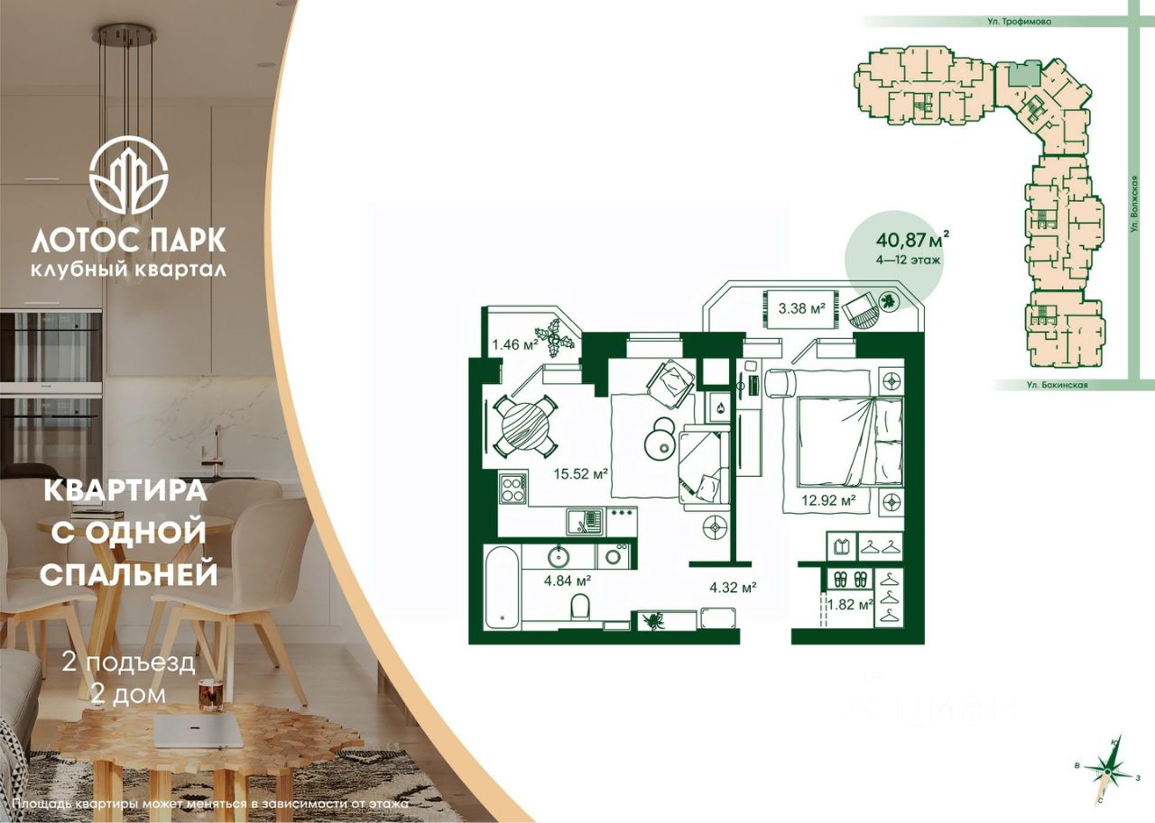 Продаётся 1-комнатная квартира в строящемся доме (Дом 1), срок сдачи: IV-кв. 2025, общей площадью 40.87 кв.м., на 4 этаже.