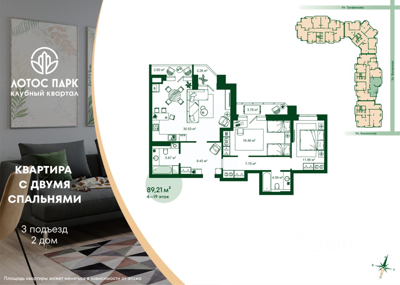 Продаётся 2-комнатная квартира в строящемся доме (Дом 2), срок сдачи: I-кв. 2026, общей площадью 89.21 кв.м., на 16 этаже.