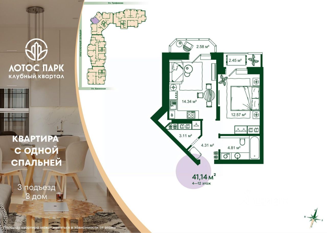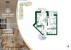 Продаётся 1-комнатная квартира в строящемся доме (Дом 2), срок сдачи: I-кв. 2026, общей площадью 41.14 кв.м., на 4 этаже.