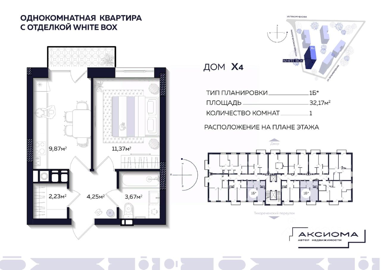 Продаётся 1-комнатная квартира в строящемся доме (Дом 4), срок сдачи: II-кв. 2027, общей площадью 32.17 кв.м., на 8 этаже. Аксиома на Тихореченской