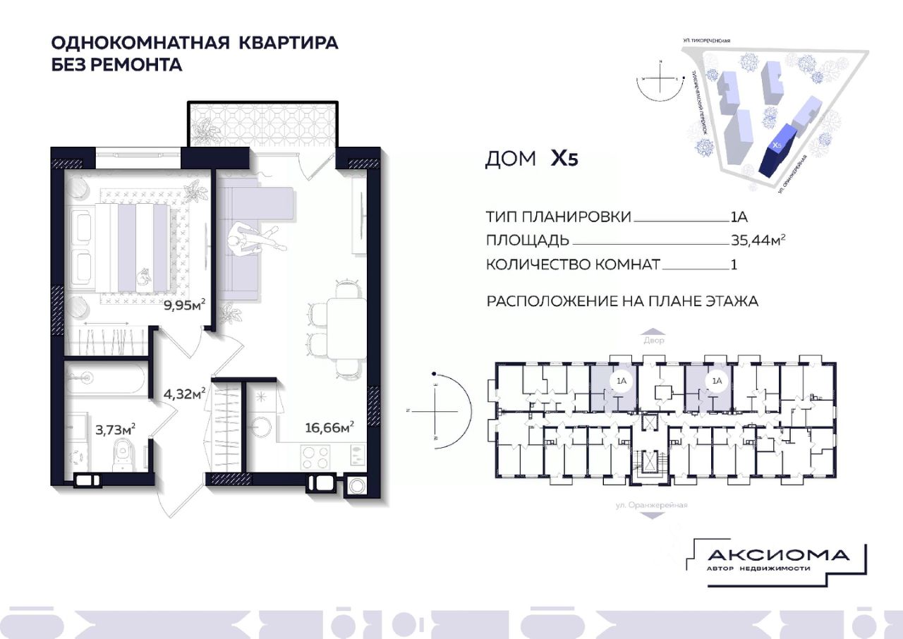 Продаётся 1-комнатная квартира в строящемся доме (Дом 5), срок сдачи: II-кв. 2027, общей площадью 35.44 кв.м., на 2 этаже. Аксиома на Тихореченской