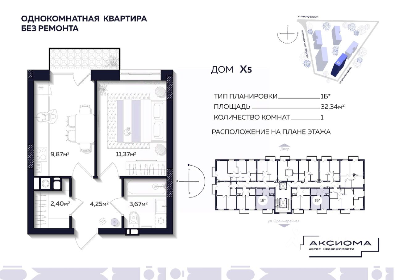 Продаётся 1-комнатная квартира в строящемся доме (Дом 5), срок сдачи: IV-кв. 2026, общей площадью 32.34 кв.м., на 2 этаже. Аксиома на Тихореченской