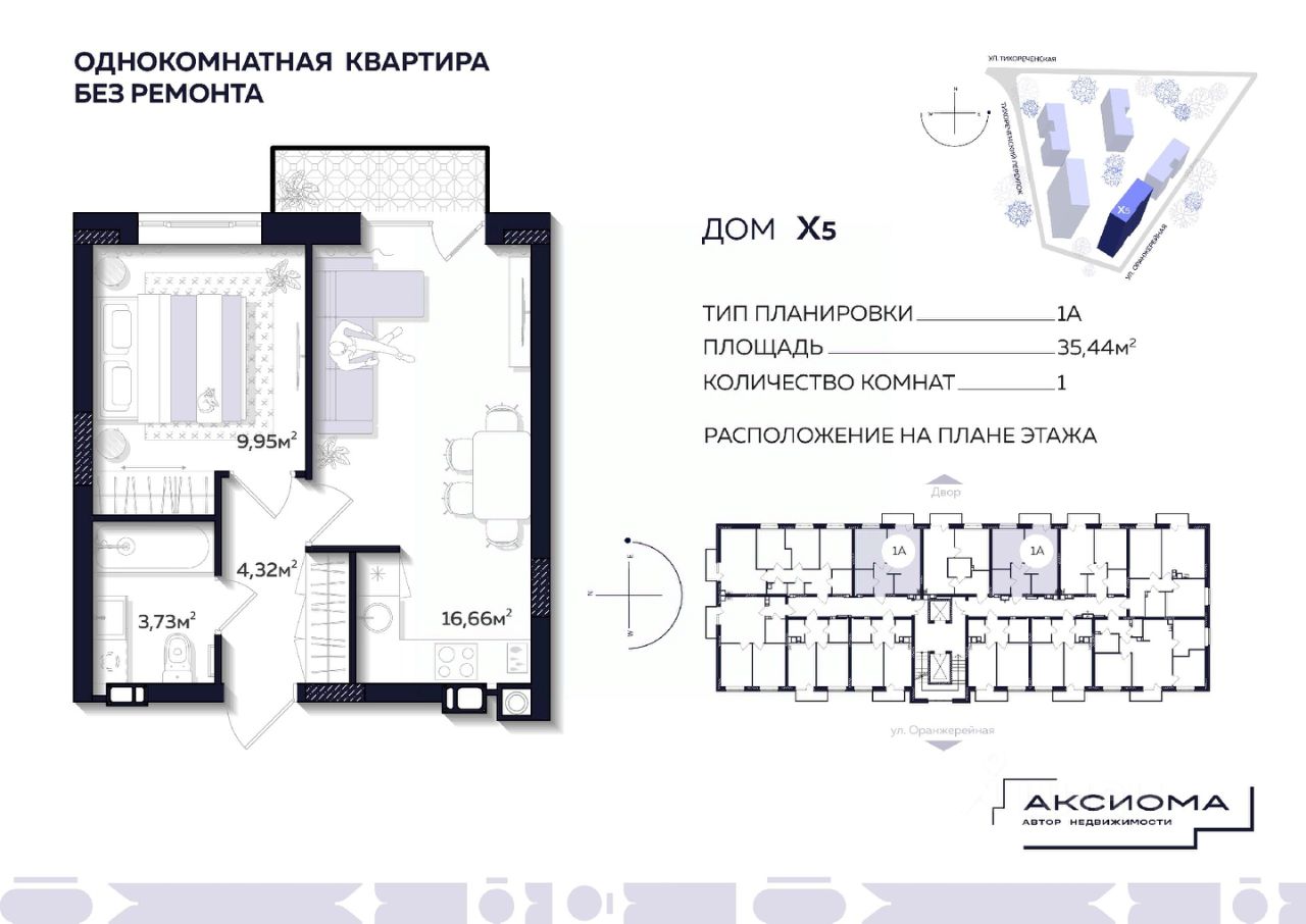 Продаётся 1-комнатная квартира в строящемся доме (Дом 5), срок сдачи: IV-кв. 2026, общей площадью 35.44 кв.м., на 7 этаже. Аксиома на Тихореченской