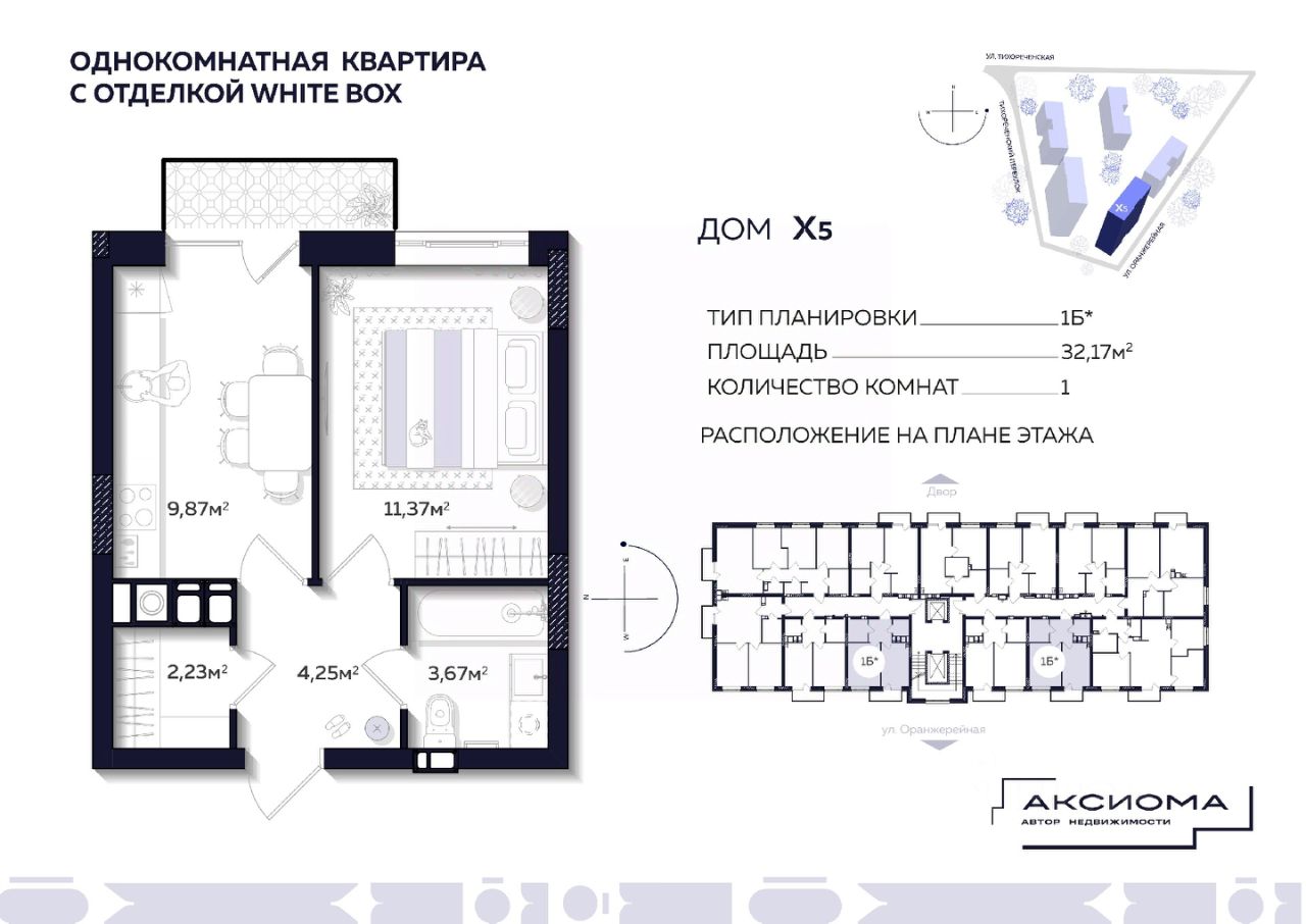 Продаётся 1-комнатная квартира в строящемся доме (Дом 5), срок сдачи: IV-кв. 2026, общей площадью 32.17 кв.м., на 9 этаже. Аксиома на Тихореченской