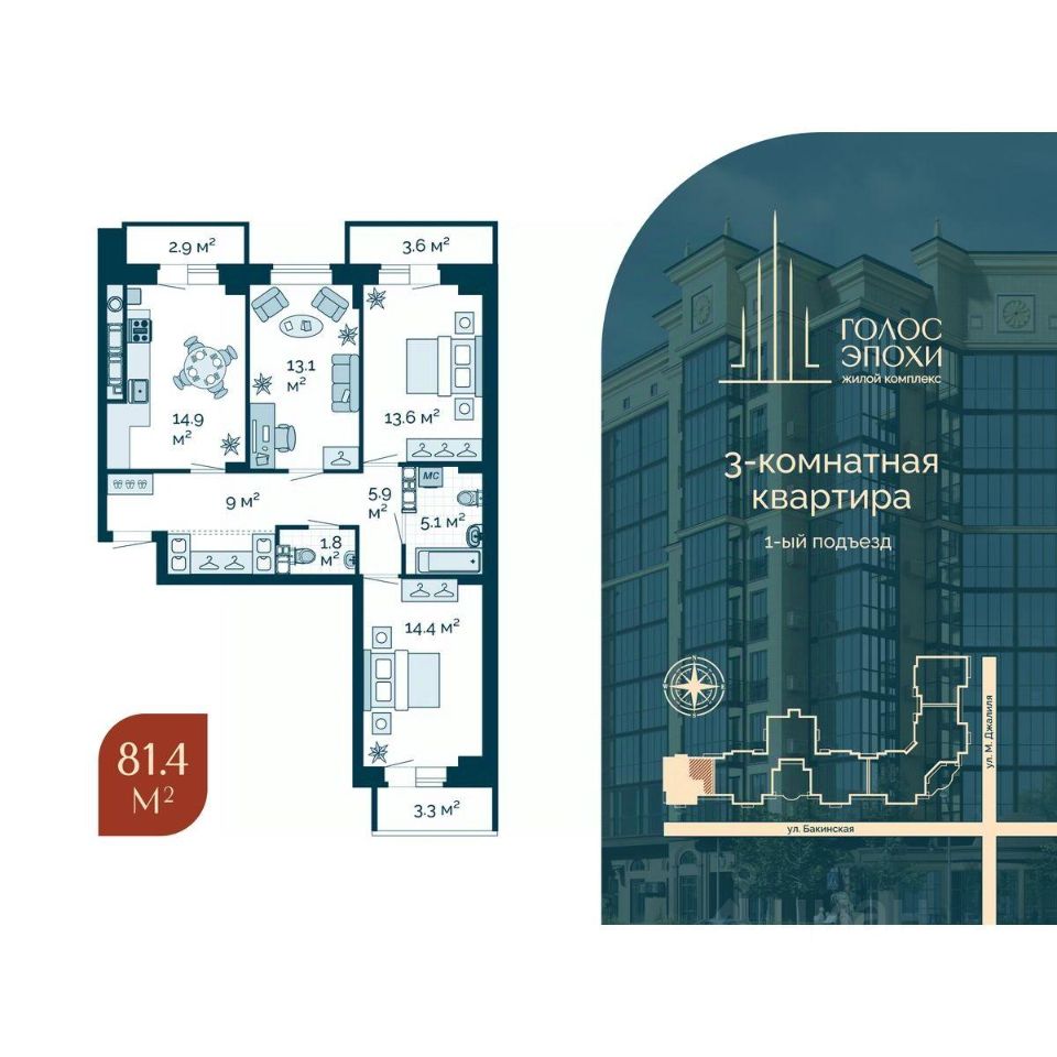 Продаётся 3-комнатная квартира в строящемся доме (Дом 1), срок сдачи: II-кв. 2026, общей площадью 81.4 кв.м., на 2 этаже. Жилой комплекс "Голос Эпохи" возводится в центральной части города Астрахань. Представляет собой девяти этажное кирпично-монолитное здание на 192 квартиры и 16 офисных помещений, выполненное в стиле АР-ДЕКО.