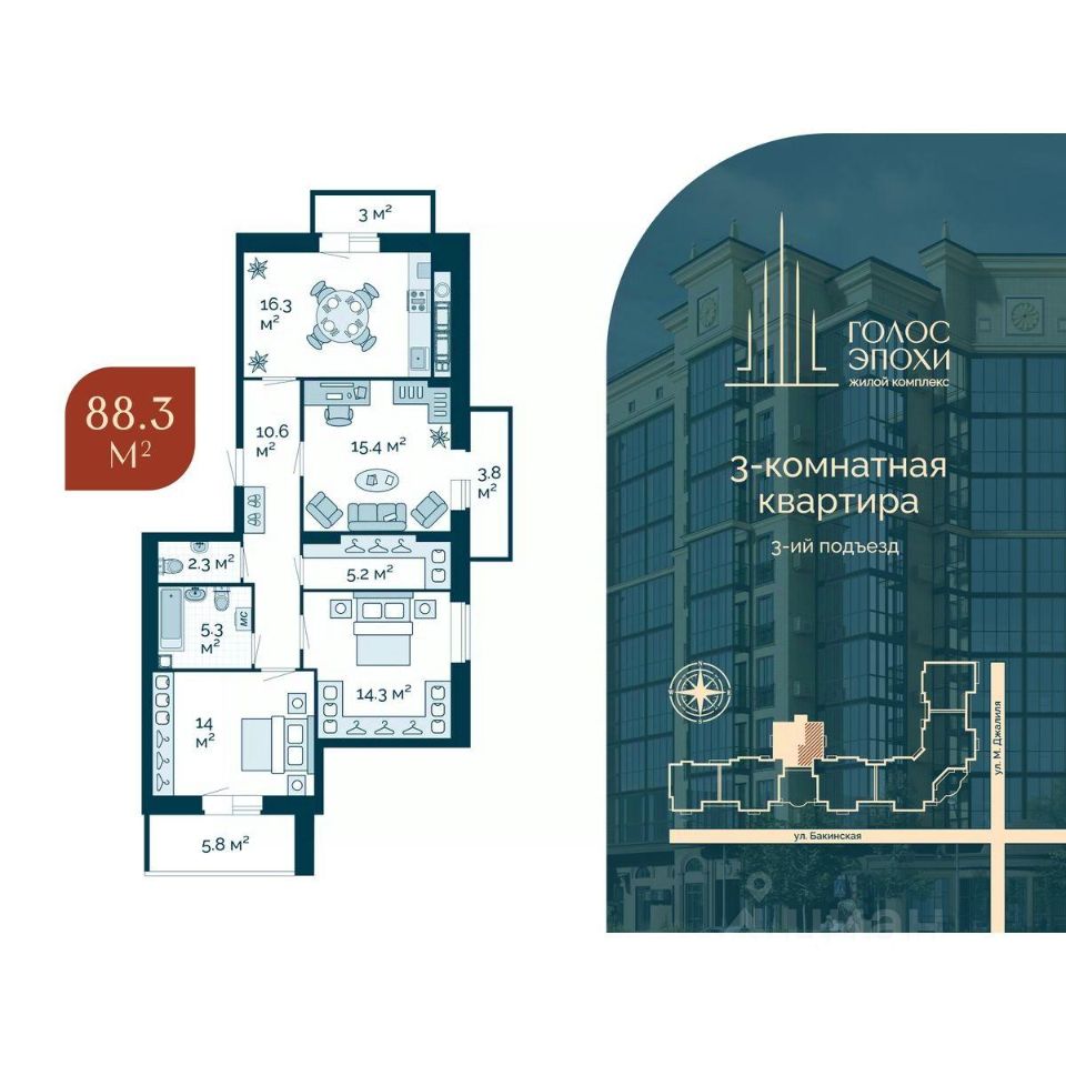 Продаётся 3-комнатная квартира в строящемся доме (Дом 1), срок сдачи: IV-кв. 2025, общей площадью 88.3 кв.м., на 4 этаже. Жилой комплекс "Голос Эпохи" возводится в центральной части города Астрахань. Представляет собой девяти этажное кирпично-монолитное здание на 192 квартиры и 16 офисных помещений, выполненное в стиле АР-ДЕКО.