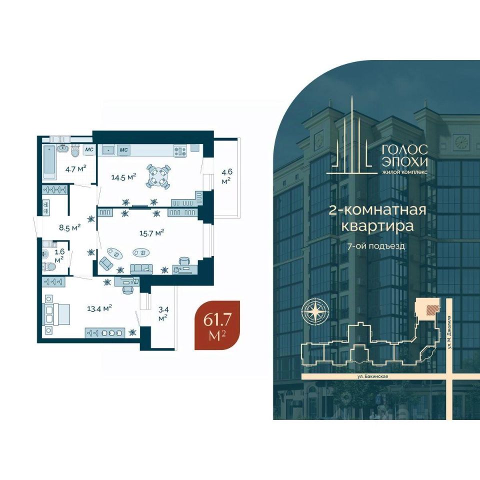 Продаётся 2-комнатная квартира в строящемся доме (Дом 1), срок сдачи: IV-кв. 2025, общей площадью 61.7 кв.м., на 6 этаже. Жилой комплекс "Голос Эпохи" возводится в центральной части города Астрахань. Представляет собой девяти этажное кирпично-монолитное здание на 192 квартиры и 16 офисных помещений, выполненное в стиле АР-ДЕКО.