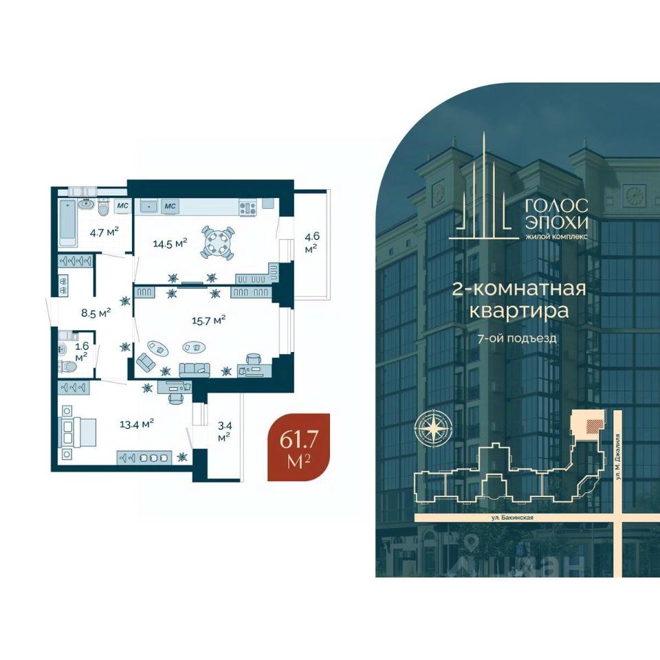 Продаётся 2-комнатная квартира в строящемся доме (Дом 1), срок сдачи: IV-кв. 2025, общей площадью 61.7 кв.м., на 8 этаже. Жилой комплекс "Голос Эпохи" возводится в центральной части города Астрахань. Представляет собой девяти этажное кирпично-монолитное здание на 192 квартиры и 16 офисных помещений, выполненное в стиле АР-ДЕКО. Основные черты архитектуры здания: роскошь, помпезность, величественность и монументальность Сталинского Ампира, выполненные в современном стиле. Этот дом, отражает новую эпоху достижений человека. Преимущества комплекса: • Дизайн-проект дома выполнен в торжественном и одновременно изящном стиле. • Дизайнерское решение мест общего пользования. В каждом подъезде предусмотрены вело-колясочные и гостевые холлы, пандусы для инвалидов • Полностью закрытая внутридомовая территория • Безопасные детские и спортивные площадки • Крытый паркинг 61 машино-место + гостевые парковочные места внутри двора (второй этаж) и вне дома • Видеонаблюдение и умная домофония Удобная транспортная развязка. Вокруг ЖК множество социально-значимых объектов. В шаговой доступности: - три крупных торгово-развлекательных и бизнес-центра; - образовательные и дошкольные учреждения; - учреждения здравоохранения; - места проведения досуга (рестораны, бары, кофейни). - отсутствие экологически "грязного" производства Технические особенности дома: •Внешние стены дома выполнены из керамического термоблока с облицовочным керамическим кирпичом. Экологически чистый материал, высокая теплоэффективность, обладает функцией шумоизоляции. • Окна с внешней стороны дома панорамные утепленный алюминий, применяется в холодных помещениях. В жилых помещениях ПВХ позволяет сохранять тепло и препятствует влагообразованию. • Вентиляционные каналы фирмы Schiedel Разводка отопления и воды выполнена из сшитого полиэтилена. Преимущества: отсутствие коррозии и экономия в отоплении они безопасно монтируются в стяжку и термоустойчивы. В доме предусмотрено газовое индивидуальное отопление и газовая плита Квартиры сдаются в следующем комплекте: • Отделка White Box - тщательная предчистовая отделка, после которой можно выполнять чистовые работы • Высота потолков 3 м, с учетом стяжки под напольное покрытие • Немецкие котлы, фирмы Vaillant, экономичное газопотребление, бесшумность • Входная металлическая дверь • Алюминиевые радиаторы • Полная разводка электрики • Разводка отопления и воды выполнена из сшитого полиэтилена. Преимущества: отсутствие коррозии и экономия в отоплении они безопасно монтируются в стяжку и термоустойчивы. В доме предусмотрено газовое индивидуальное отопление и газовая плита • Возможно согласование теплых полов на этапе стройки Описание комплекса Жилой комплекс "Голос Эпохи", представляет собой 9ти этажное кирпично-монолитное здание, выполненное в торжественном и одновременно изящном стиле ардеко. Величественность Сталинского Ампира, в современном исполнении. Роскошь и масштаб прошлого с технологичностью настоящего. В комплексе представлены планировочные реш