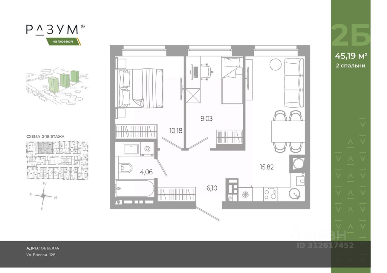 "РАЗУМ на Боевой" жилой комплекс компании "РАЗУМ", создателя "Сердце Каспия" и "Наследие". Проект из трех 18-этажных домов расположен в самом центре Советского района, на улице Боевая. В пешей доступности: - 3 школы; - 3 детских сада; - магазины; - автобусная остановка; Главная особенность проекта — угловое остекление, которое составляет 22% от всей площади. Все окна в квартирах находятся на высоте 62 см от пола, а на восемнадцатом этаже подоконник расположен всего в 42 см от пола. Во дворе-парке для детей создана своя развивающая среда, где каждый ребёнок может найти себе занятия и игры по душе. Здесь дети активно развиваются и познают окружающий мир. Игровые конструкции изготовлены из натуральных материалов, поэтому они не замерзают на морозе и не нагреваются на солнце. Необычные формы конструкций развивают образное мышление у детей и помогают им придумывать интересные и нестандартные игры. "РАЗУМ на Боевой" — это: - территория без машин; - безбарьерная среда; - единый эко-стиль в оформлении дворового пространства; - увеличенная площадь озеленения во дворе-парке; - многоуровневое освещение и подсветка фасадов; - видеонаблюдение; - эстетичные подъездные холлы; - колясочные и велосипедные зоны; - кладовые на каждом этаже. В проекте представлены 13 планировочных решений с площадью квартир от 21 м² до 62.2 м² с функциональным разделением на гостевую и приватные зоны.