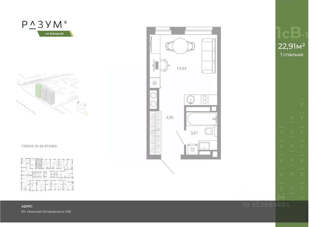 РАЗУМ на Звездной высотный жилой комплекс компании РАЗУМ, создателя Сердце Каспия и Наследие. Здесь есть: развитый район, закрытая безопасная территория и транспортная доступность. Три 26-этажных дома расположены в границах ул. Звездной и Николая Островского. В пешей доступности: - 3 школы; - 4 государственных детских сада; - гипермаркет; - супермаркеты; - развивающие образовательные центры. РАЗУМ на Звездной это: - 60% озеленения в благоустройстве, детские игровые конструкции и зоны отдыха выполнены из экологичных материалов; - многоуровневое освещение территории с архитектурной подсветкой комплекса; - закрытая территория комплекса и видеонаблюдение по периметру и в холлах; - безбарьерная среда на территории жилого комплекса: удобство для велосипедистов, родителей с маленькими с детьми и путешественников с большими чемоданами; - уютная зона ожидания с мягкой мебелью в холлах проекта и раздельные зоны под колясочные и велосипедные; - кладовые помещения на каждом этаже. В проекте РАЗУМ на Звездной представлено 13 планировочных решений от 21,08 м² до 63,39 м². Есть квартиры с предчистовой отделкой. В квартирах выровнены стены, выполнена полусухая стяжка пола, установлены радиаторы и трехконтурный газовый котел. В квартиру заведено электричество и установлена входная дверь.