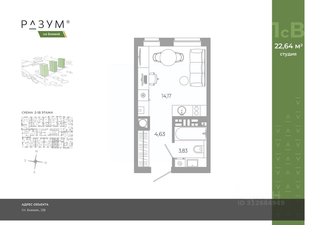 "РАЗУМ на Боевой" жилой комплекс компании "РАЗУМ", создателя "Сердце Каспия" и "Наследие". Проект из трех 18-этажных домов расположен в самом центре Советского района, на улице Боевая. В пешей доступности: - 3 школы; - 3 детских сада; - магазины; - автобусная остановка; Главная особенность проекта — угловое остекление, которое составляет 22% от всей площади. Все окна в квартирах находятся на высоте 62 см от пола, а на восемнадцатом этаже подоконник расположен всего в 42 см от пола. Во дворе-парке для детей создана своя развивающая среда, где каждый ребёнок может найти себе занятия и игры по душе. Здесь дети активно развиваются и познают окружающий мир. Игровые конструкции изготовлены из натуральных материалов, поэтому они не замерзают на морозе и не нагреваются на солнце. Необычные формы конструкций развивают образное мышление у детей и помогают им придумывать интересные и нестандартные игры. "РАЗУМ на Боевой" — это: - территория без машин; - безбарьерная среда; - единый эко-стиль в оформлении дворового пространства; - увеличенная площадь озеленения во дворе-парке; - многоуровневое освещение и подсветка фасадов; - видеонаблюдение; - эстетичные подъездные холлы; - колясочные и велосипедные зоны; - кладовые на каждом этаже. В проекте представлены 13 планировочных решений с площадью квартир от 21 м² до 62.2 м² с функциональным разделением на гостевую и приватные зоны.