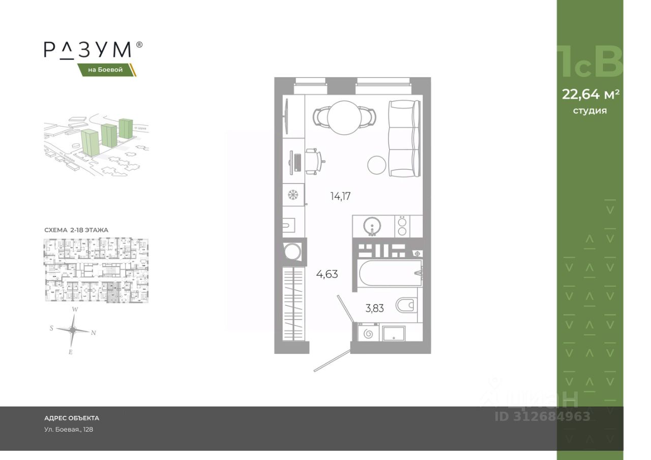 РАЗУМ на Боевой жилой комплекс компании РАЗУМ, создателя Сердце Каспия и Наследие. Проект из трех 18-этажных домов расположен в самом центре Советского района, на улице Боевая. В пешей доступности: - 3 школы; - 3 детских сада; - магазины; - автобусная остановка; Главная особенность проекта — угловое остекление, которое составляет 22% от всей площади. Все окна в квартирах находятся на высоте 62 см от пола, а на восемнадцатом этаже подоконник расположен всего в 42 см от пола. Во дворе-парке для детей создана своя развивающая среда, где каждый ребёнок может найти себе занятия и игры по душе. Здесь дети активно развиваются и познают окружающий мир. Игровые конструкции изготовлены из натуральных материалов, поэтому они не замерзают на морозе и не нагреваются на солнце. Необычные формы конструкций развивают образное мышление у детей и помогают им придумывать интересные и нестандартные игры. РАЗУМ на Боевой — это: - территория без машин; - безбарьерная среда; - единый эко-стиль в оформлении дворового пространства; - увеличенная площадь озеленения во дворе-парке; - многоуровневое освещение и подсветка фасадов; - видеонаблюдение; - эстетичные подъездные холлы; - колясочные и велосипедные зоны; - кладовые на каждом этаже. В проекте представлены 13 планировочных решений с площадью квартир от 21 м² до 62.2 м² с функциональным разделением на гостевую и приватные зоны.