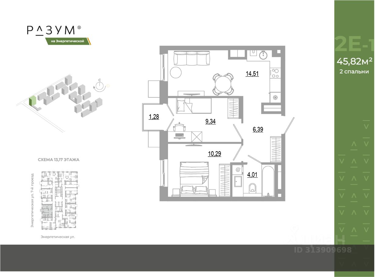 "РАЗУМ на Энергетической" — первый масштабный жилой район от девелопера "РАЗУМ" площадью 12 гектаров в мкр. Бабаевского на ул. Энергетическая, созданный по концепции "город в городе". Это 4 квартала — 18 домов от 10 до 18 этажей с собственными школой, детским садом и торговым центром. В каждом квартале есть свой двор-парк с локациями развлечений и отдыха, беседками и цветущими растениями. А также прогулочный бульвар "Свой центр" с площадками для тихого отдыха и активностей с отдельной экосистемой коммерции для всей семьи. 12 га застройка Детский сад на 250 мест Школа Торговый центр 2,5 км велодорожки с двусторонним движением "Город в городе" со своей коммерцией Спортивные пространства 60 % озеленения Зона ожидания в холле Кладовые в 14 и 18-этажных башнях Квартиры с балконами Квартиры с террасами на 1 этажах, выходящие в закрытый двор Индивидуальное отопление
