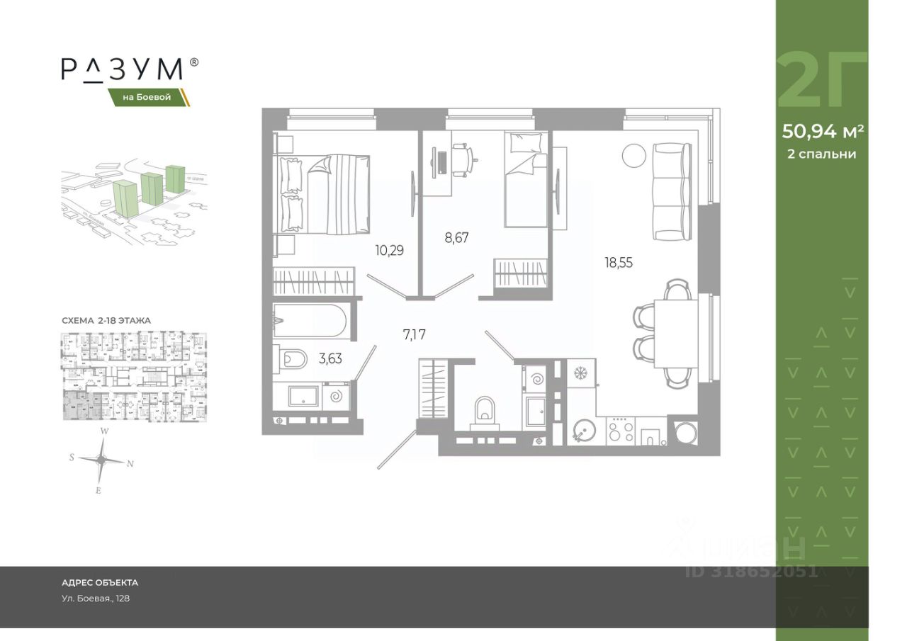 "РАЗУМ на Боевой" жилой комплекс компании "РАЗУМ", создателя "Сердце Каспия" и "Наследие". Проект из трех 18-этажных домов расположен в самом центре Советского района, на улице Боевая. В пешей доступности: - 3 школы; - 3 детских сада; - магазины; - автобусная остановка; Главная особенность проекта — угловое остекление, которое составляет 22% от всей площади. Все окна в квартирах находятся на высоте 62 см от пола, а на восемнадцатом этаже подоконник расположен всего в 42 см от пола. Во дворе-парке для детей создана своя развивающая среда, где каждый ребёнок может найти себе занятия и игры по душе. Здесь дети активно развиваются и познают окружающий мир. Игровые конструкции изготовлены из натуральных материалов, поэтому они не замерзают на морозе и не нагреваются на солнце. Необычные формы конструкций развивают образное мышление у детей и помогают им придумывать интересные и нестандартные игры. "РАЗУМ на Боевой" — это: - территория без машин; - безбарьерная среда; - единый эко-стиль в оформлении дворового пространства; - увеличенная площадь озеленения во дворе-парке; - многоуровневое освещение и подсветка фасадов; - видеонаблюдение; - эстетичные подъездные холлы; - колясочные и велосипедные зоны; - кладовые на каждом этаже. В проекте представлены 13 планировочных решений с площадью квартир от 21 м² до 62.2 м² с функциональным разделением на гостевую и приватные зоны.