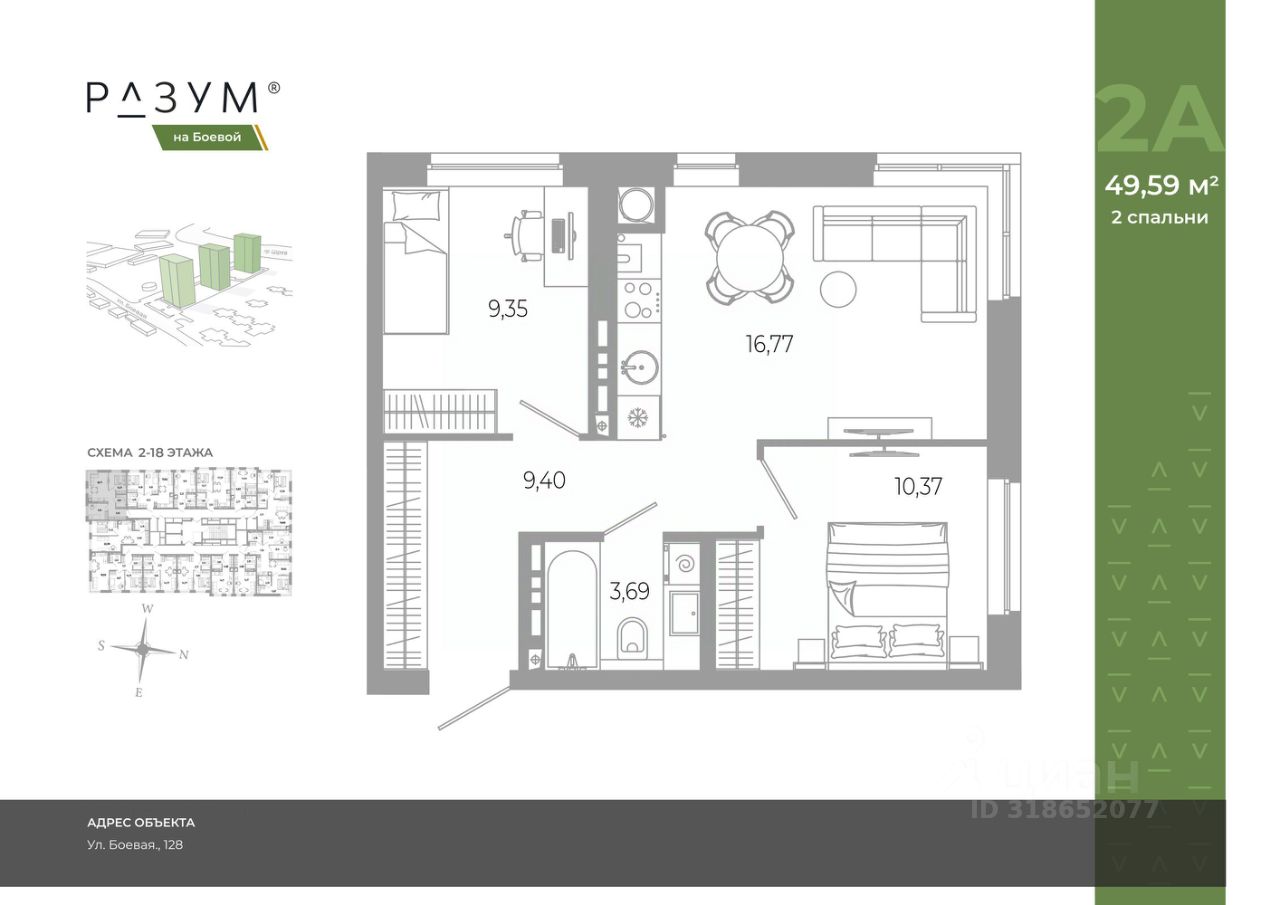 "РАЗУМ на Боевой" жилой комплекс компании "РАЗУМ", создателя "Сердце Каспия" и "Наследие". Проект из трех 18-этажных домов расположен в самом центре Советского района, на улице Боевая. В пешей доступности: - 3 школы; - 3 детских сада; - магазины; - автобусная остановка; Главная особенность проекта — угловое остекление, которое составляет 22% от всей площади. Все окна в квартирах находятся на высоте 62 см от пола, а на восемнадцатом этаже подоконник расположен всего в 42 см от пола. Во дворе-парке для детей создана своя развивающая среда, где каждый ребёнок может найти себе занятия и игры по душе. Здесь дети активно развиваются и познают окружающий мир. Игровые конструкции изготовлены из натуральных материалов, поэтому они не замерзают на морозе и не нагреваются на солнце. Необычные формы конструкций развивают образное мышление у детей и помогают им придумывать интересные и нестандартные игры. "РАЗУМ на Боевой" — это: - территория без машин; - безбарьерная среда; - единый эко-стиль в оформлении дворового пространства; - увеличенная площадь озеленения во дворе-парке; - многоуровневое освещение и подсветка фасадов; - видеонаблюдение; - эстетичные подъездные холлы; - колясочные и велосипедные зоны; - кладовые на каждом этаже. В проекте представлены 13 планировочных решений с площадью квартир от 21 м² до 62.2 м² с функциональным разделением на гостевую и приватные зоны.