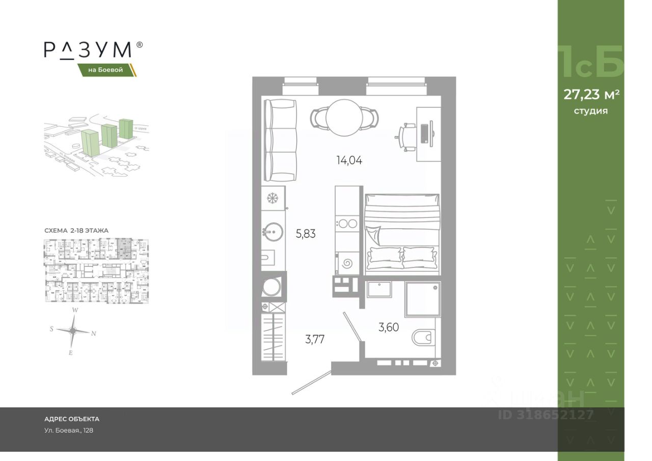 "РАЗУМ на Боевой" жилой комплекс компании "РАЗУМ", создателя "Сердце Каспия" и "Наследие". Проект из трех 18-этажных домов расположен в самом центре Советского района, на улице Боевая. В пешей доступности: - 3 школы; - 3 детских сада; - магазины; - автобусная остановка; Главная особенность проекта — угловое остекление, которое составляет 22% от всей площади. Все окна в квартирах находятся на высоте 62 см от пола, а на восемнадцатом этаже подоконник расположен всего в 42 см от пола. Во дворе-парке для детей создана своя развивающая среда, где каждый ребёнок может найти себе занятия и игры по душе. Здесь дети активно развиваются и познают окружающий мир. Игровые конструкции изготовлены из натуральных материалов, поэтому они не замерзают на морозе и не нагреваются на солнце. Необычные формы конструкций развивают образное мышление у детей и помогают им придумывать интересные и нестандартные игры. "РАЗУМ на Боевой" — это: - территория без машин; - безбарьерная среда; - единый эко-стиль в оформлении дворового пространства; - увеличенная площадь озеленения во дворе-парке; - многоуровневое освещение и подсветка фасадов; - видеонаблюдение; - эстетичные подъездные холлы; - колясочные и велосипедные зоны; - кладовые на каждом этаже. В проекте представлены 13 планировочных решений с площадью квартир от 21 м² до 62.2 м² с функциональным разделением на гостевую и приватные зоны.