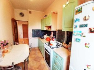 В квартире натяжные потолки с потолочными светильниками , на полу ламинат и линолеум, окна ПВХ, радиаторы биметаллика, металлическая входная дверь.