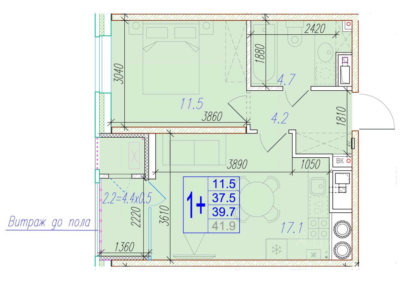 Общая площадь39,7 м²