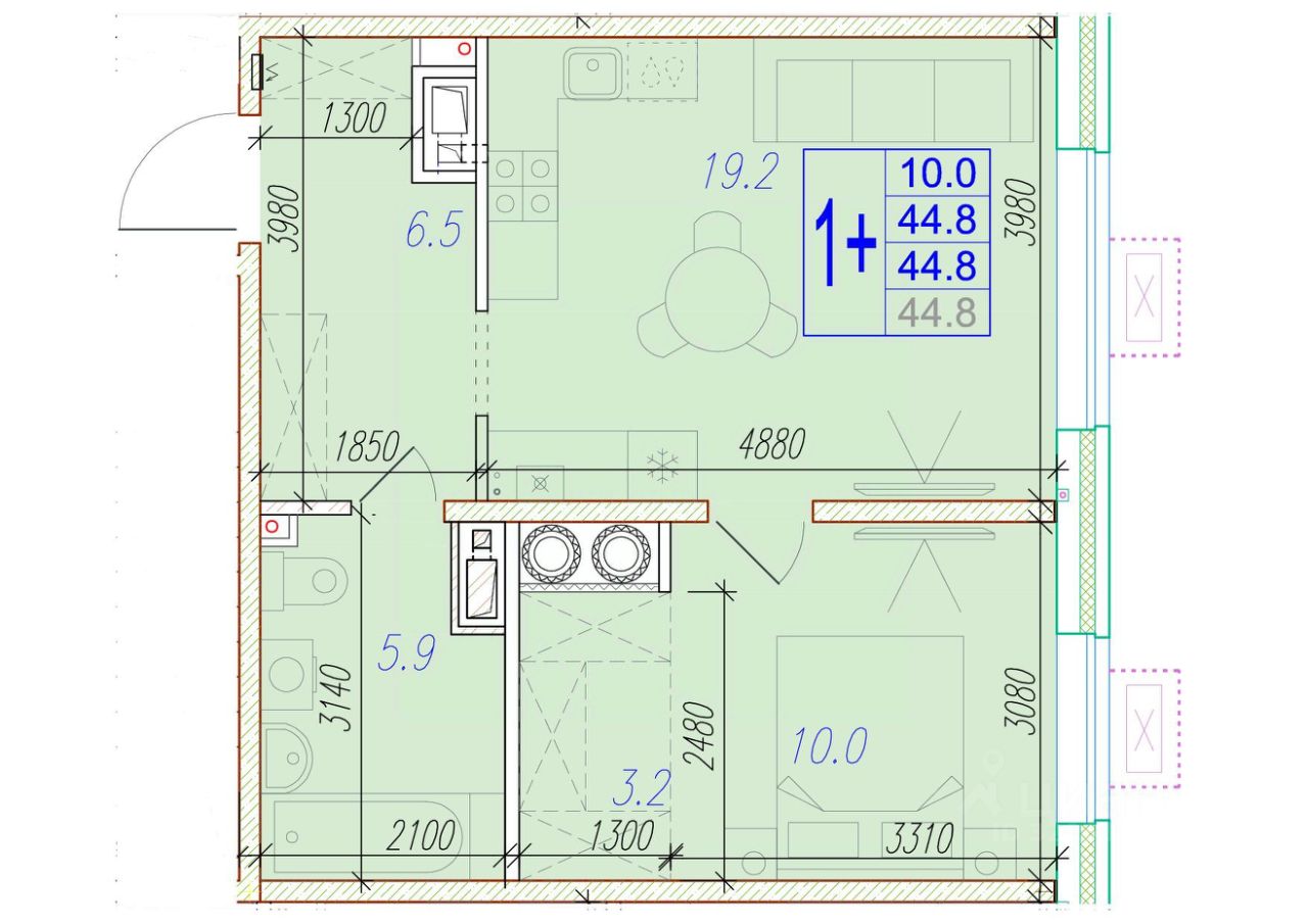 Общая площадь44,8 м²