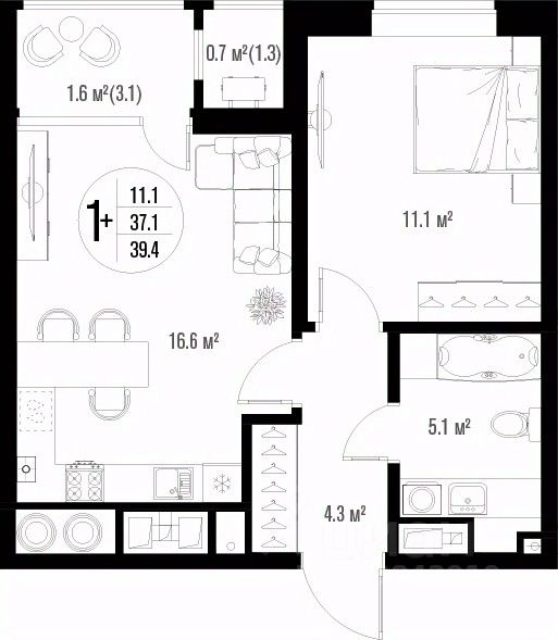 Общая площадь39,4 м²