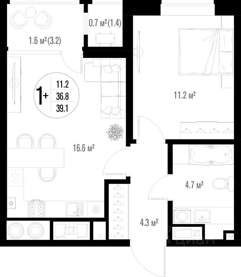Общая площадь39,1 м²