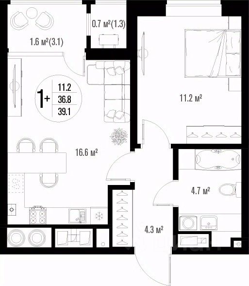 Общая площадь39,1 м²