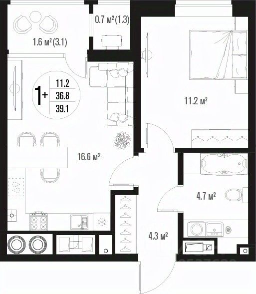 Общая площадь39,1 м²