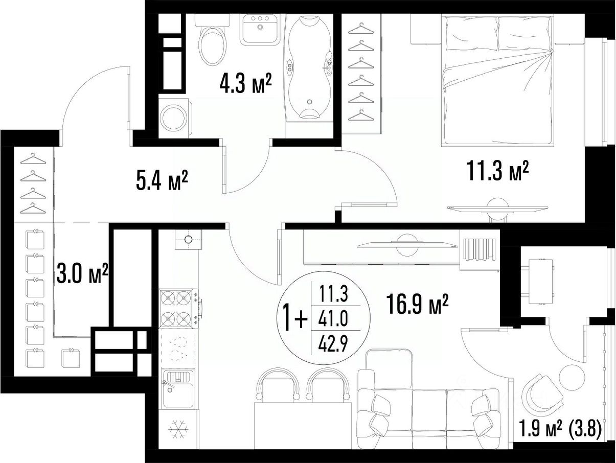 Общая площадь42,9 м²