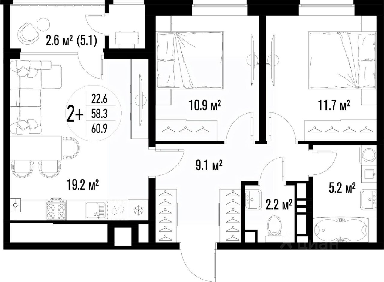 Общая площадь60,9 м²