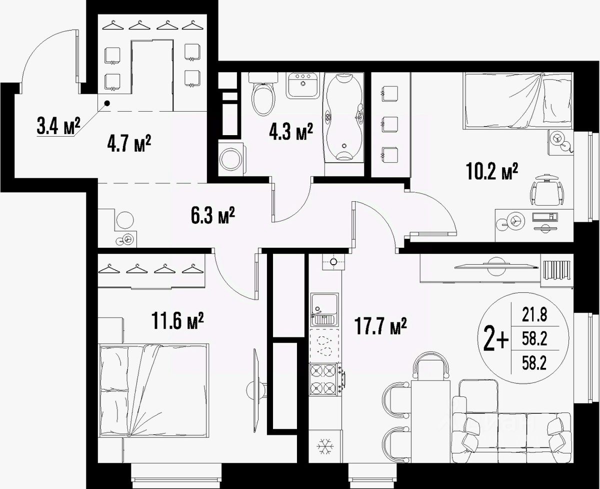 Общая площадь58,2 м²