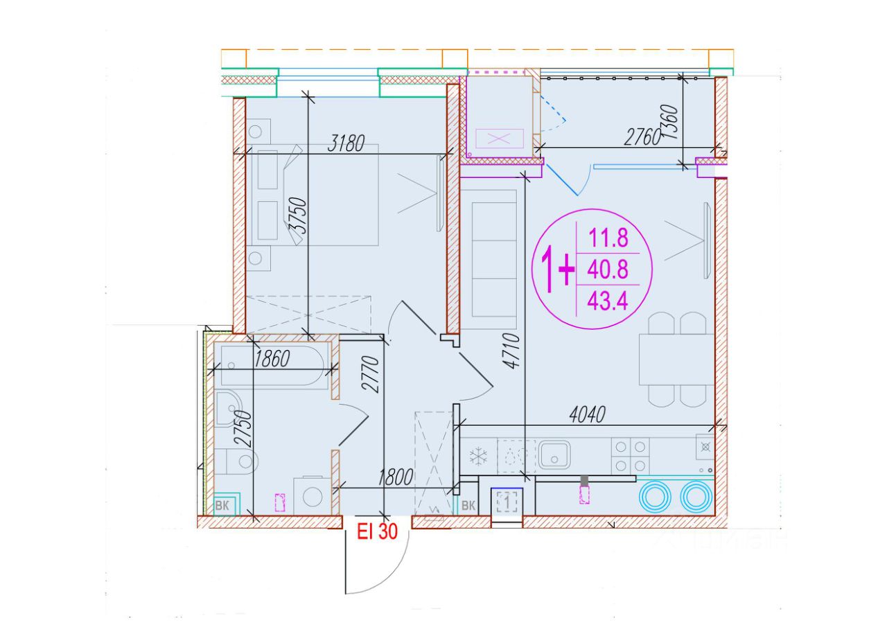 Общая площадь43,4 м²