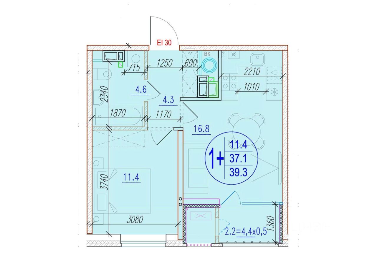 Общая площадь39,3 м²