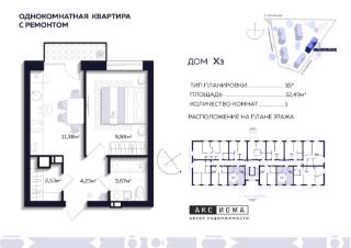 Продаётся 1-комнатная квартира в строящемся доме (Дом 3), срок сдачи: I-кв. 2026, общей площадью 32.49 кв.м., на 4 этаже. Аксиома на Тихореченской