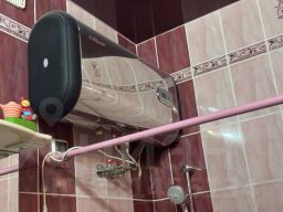 В ванной комнате стильное сочетание цветовой гаммы натяжного потолка, стен и плитки на полу. Установлен бойлер.