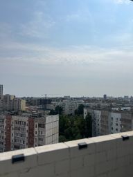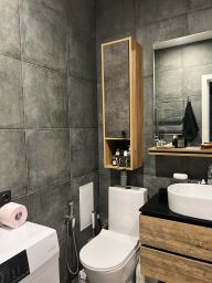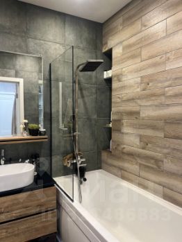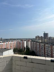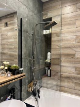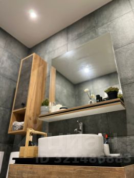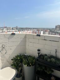 В ванной комнате выполнен дизайнерский ремонт: установлена ванна со стеклянной шторкой, дорогой унитаз, подвесная раковина и большое зеркало с подготовленным проводом для подсветки. Балкон переоборудован под террасу, на полу уложена плитка, установлены карнизы для штор. Здесь можно разместить кресла и наслаждаться видом с 13-го этажа.