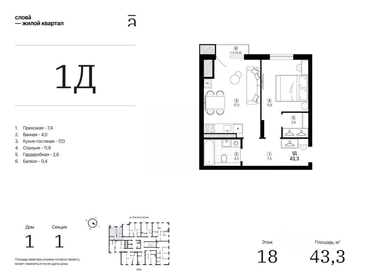 Общая площадь43,26 м²