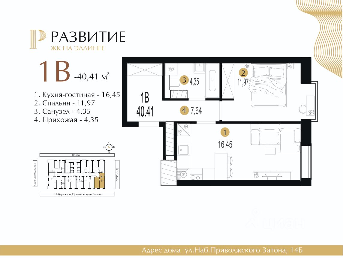 ЖК "РАЗВИТИЕ" — современный жилой комплекс класса Комфорт+ в центре города. Дом высотой 25 этажей расположен в престижной локации на Эллинге. В ЖК "РАЗВИТИЕ" уникальные видовые характеристики — из окон открываются панорамы на Приволжский затон, Волгу, Кремль и Храм Святого Владимира. Покупателям доступны 14 различных планировочных решений — от компактных студий площадью 23 м² до просторных 3-х комнатных квартир 75 м², с возможностью объединения квартир. Входные группы выполнены в формате дизайнерского лобби с четырёхметровыми потолками. Для удобства жителей предусмотрены: - консьерж-сервис, - кинозал, - детская игровая комната, - две велоколясочные, - гостевой санузел, - лапомойка для домашних животных. В доме установлено 7 современных лифтов и предусмотрено 46 кладовых помещений для хранения. Территория жилого комплекса полностью закрыта от посторонних и благоустроена: оборудованы детские и спортивные площадки, дорожка для скейтборда и велоспорта, зоны отдыха и прогулок.